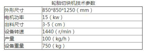 【輪胎切塊機產品介紹】 輪胎切塊機是輪胎粉碎機生產線中的第三道設備,將切成條后的輪胎切割成3-5cm的小塊,從而便于粉碎機粉碎。 【輪胎切塊機技術參數】